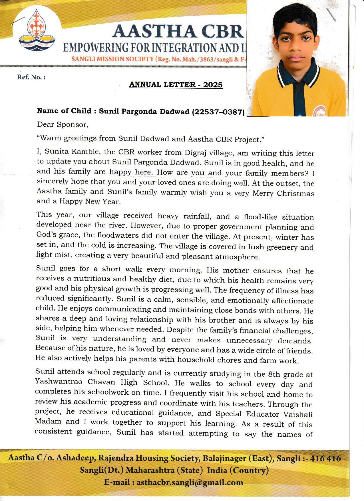 Ich, Sunita Kamble, Mitarbeiterin der CBR aus dem Dorf Digraj, schreibe Ihnen diesen Brief, um Sie über Sunil Pargonda Dadwad zu informieren. Sunil ist wohlauf, und er und seine Familie sind glücklich hier. Wie geht es Ihnen und Ihren Angehörigen? Ich hoffe sehr, dass es Ihnen und Ihren Lieben gut geht. Die Familie Aastha und Sunils Familie wünschen Ihnen ein frohes Weihnachtsfest und ein gutes neues Jahr.